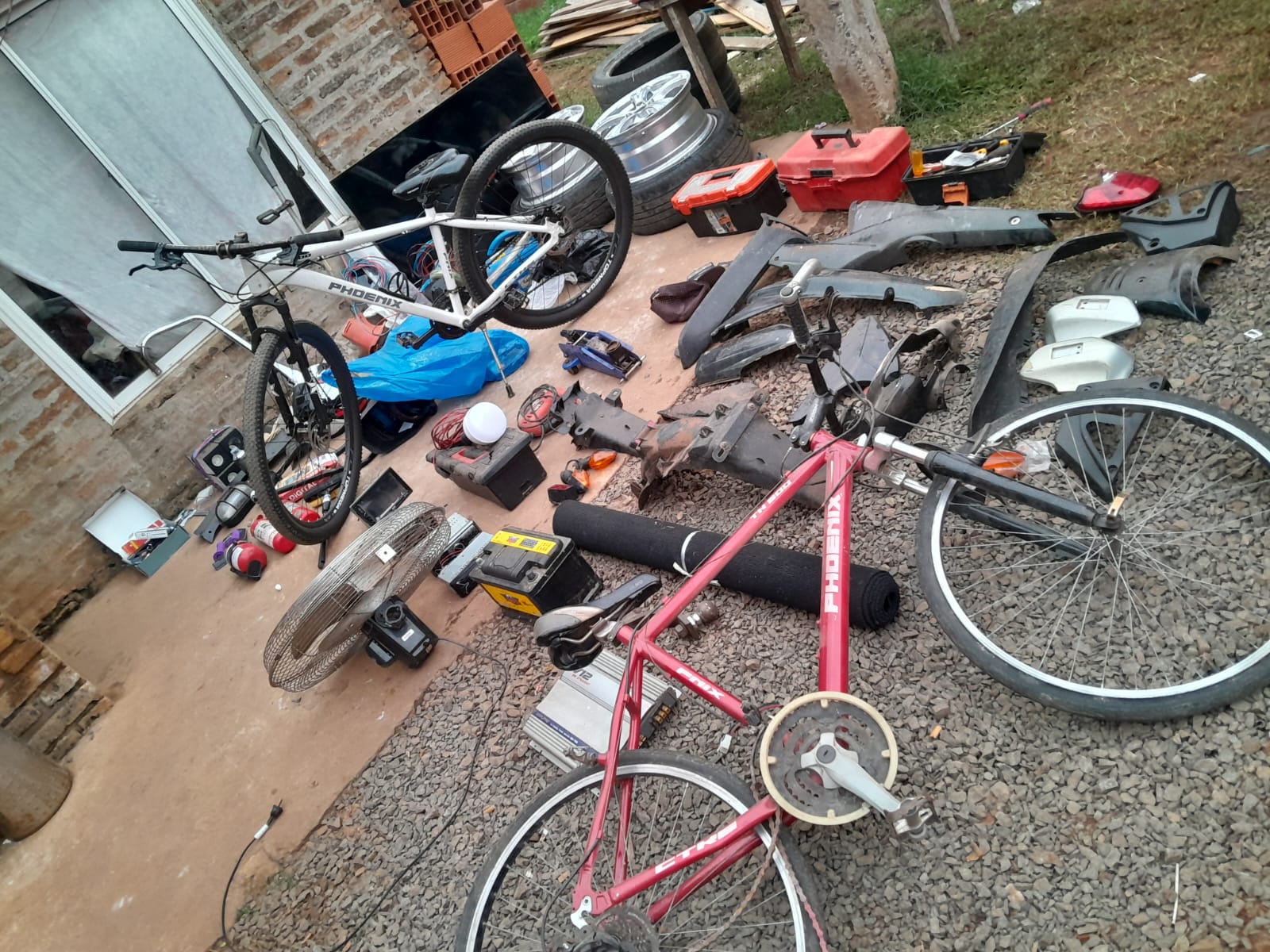 En el procedimiento, arrestaron a Cesar S. de 24 años alias Chino, quien posee un amplio prontuario por delitos contra la propiedad. Además, secuestraron partes de motocicletas, bicicletas, una motoguadaña, baterías de autos, neumáticos, stereos de vehículos, llantas entre otros elementos denunciados como sustraídos.