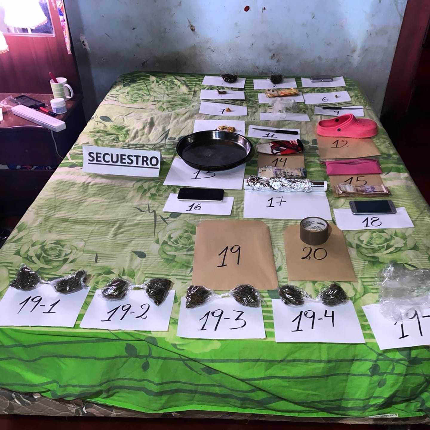 Asimismo, incautaron diez envoltorios de marihuana con un pesaje de 91 gramos, tres dosis de pedra, una balanza de precisión, cinco teléfonos celulares que serán peritados; una motocicleta 110 c.c. con el que presuntamente realizaban la actividad de narco delivery y dinero en efectivo.