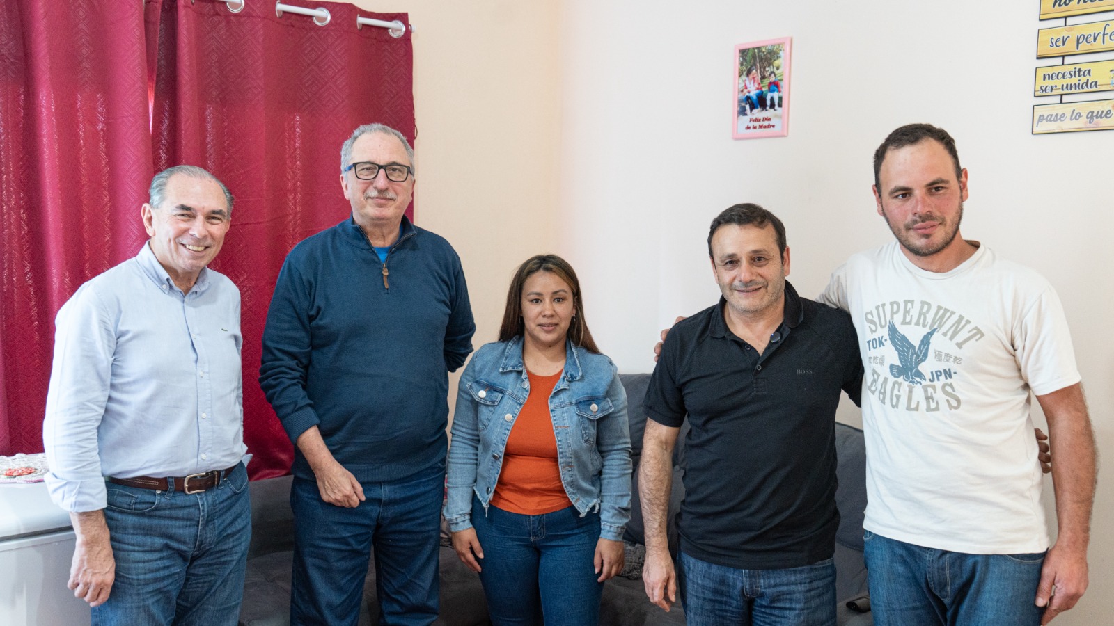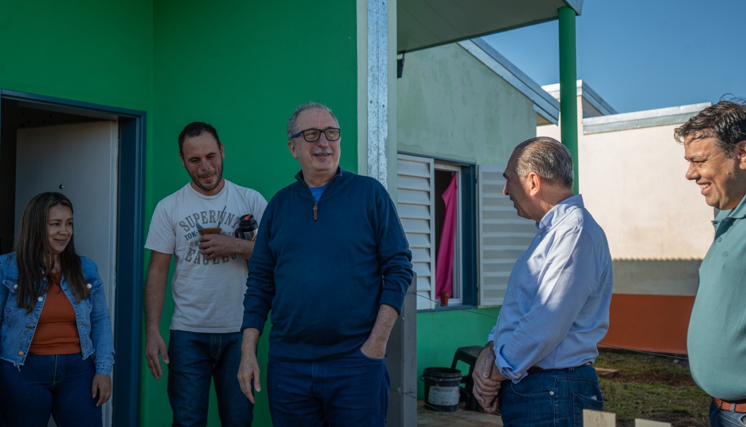 Durante la visita, los funcionarios compartieron un momento más informal con la familia, tomando mates y pan cuca en el nuevo hogar, mientras conversaban sobre la vida en el barrio y los proyectos familiares.
