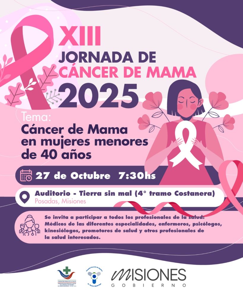 El lunes 27 de octubre se llevará a cabo la XIII Jornada de Cáncer de Mama 2025 en Posadas. El lema de este año es: “Cáncer de mama en mujeres menores de 40 años“. La actividad tendrá lugar en el Auditorio Tierra sin Mal, del 4to tramo de la Costanera posadeña a partir de las 7:30 h.
